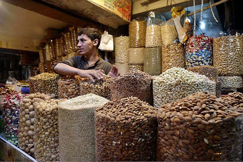 Vendor displaying dry fruits to attract the customers at bacha khan chowk
