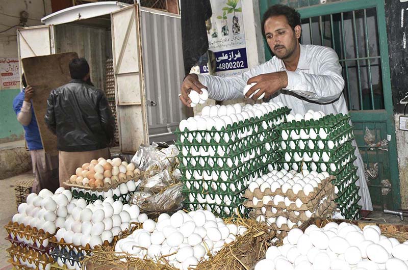 Vendor displaying eggs to attract the customers at his setup in a local market as demand increased due winter season