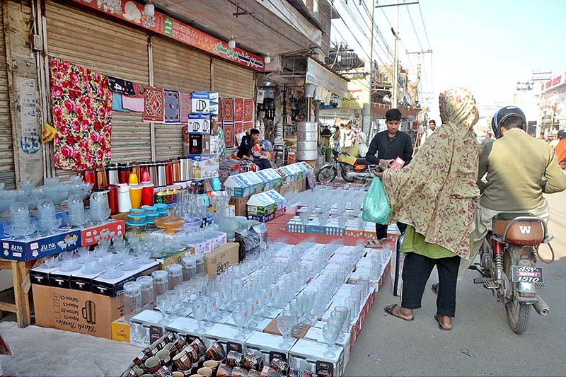 Vendor displaying Glass crockery and other items to attract customers at Chungi no.14