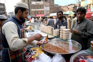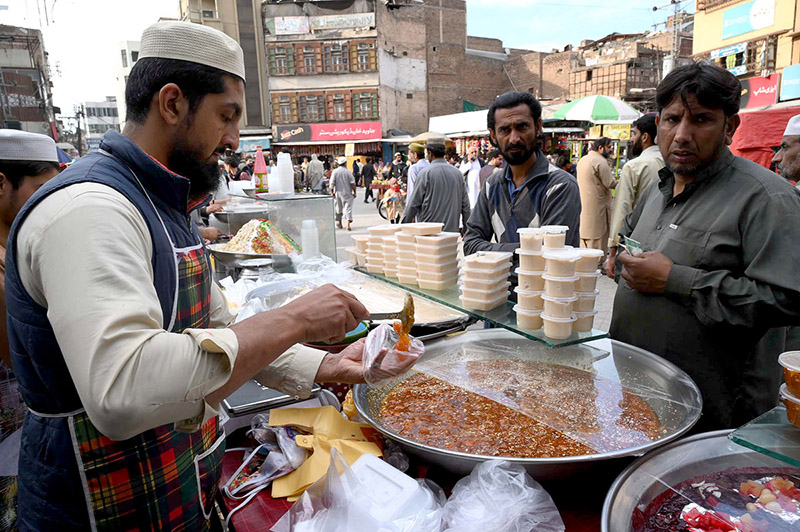 Vendor selling traditional sweet food item Kheer and Murabba at Fawara Chowk during the Islamic fasting month of Ramazan ul Mubarak