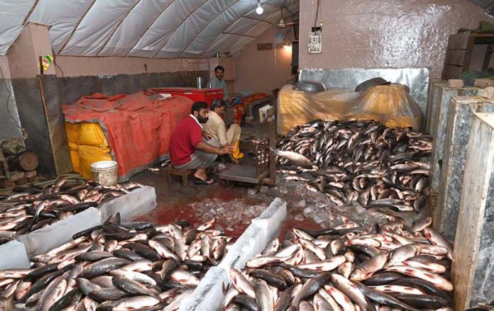 Vendors are busy sorting fish of different weights at their setup.