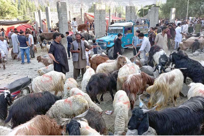 Vendors displaying sacrificial animals to attract the customers at animal market in connection with Eidul Azha