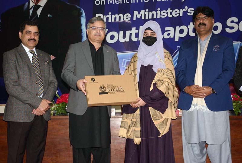 Vice Chancellor Allama Iqbal Open University Prof. Dr. Nasir Mahmood distributing laptops among students during laptop distribution ceremony held under Prime Minister’s Laptop Scheme at Regional Campus, Allama Iqbal Open University, Millat Town, Faisalabad.
