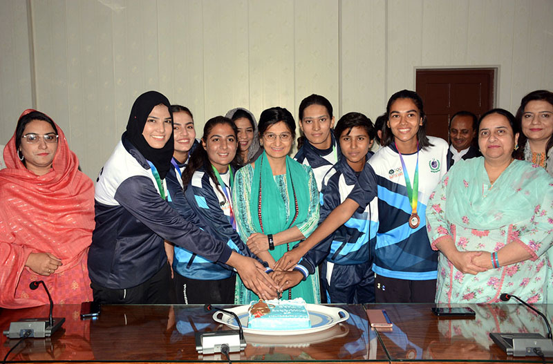 Vice Chancellor GC Women University Faisalabad (GCWUF), Prof Dr Robina Farooq is cutting cake during a ceremony organized to celebrate achievements of GCWUF Sports Stars in the 34th National Games 2023 in Quetta