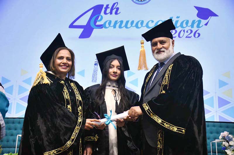 ISLAMABAD: January 22 - Vice Chancellor QAU Dr Niaz Ahmad along with Principal Prof Rozina Faheem awarding degree to student in 4th Convocation of Institute of Home Economics Art and design college F11. APP/TZD/ABB