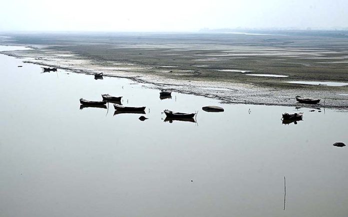 LARKANA: 10 February - View of a boat parked on the bank of the Indus River near the Larkana-Khairpur Bridge. APP/NAS/MAF/TZD/SSH