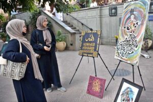 LAHORE: October 13 – Visitors admire the artwork on display during the painting exhibition organized by the Knowledge Art Academy and Fortnight School System at the historic Wazir Khan Mosque. APP/AHF/IQJ/TZD/FHA