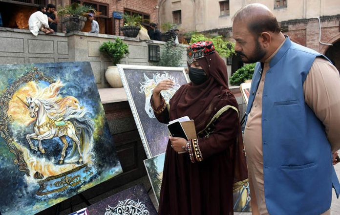 LAHORE: October 19 – Visitors viewing a painting and calligraphy exhibition at Masjid Wazir Khan Square, organized in collaboration with The Knowledge of Art Academy and the Walled City of Lahore Authority. APP/AHF/FHA
