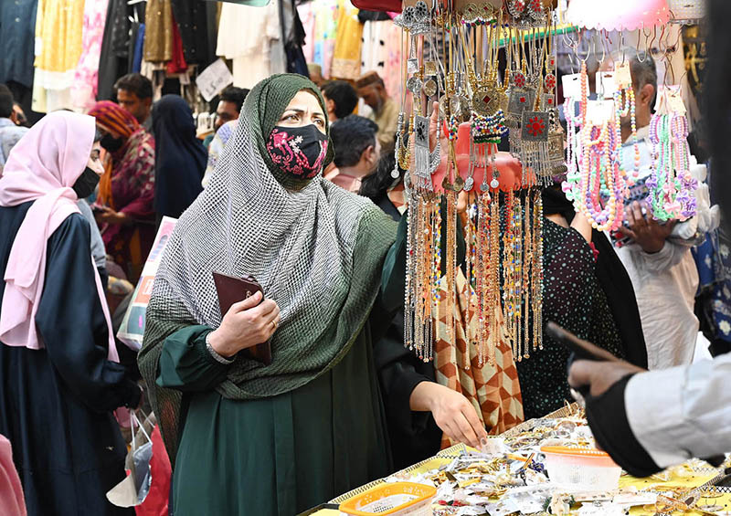 Women busy purchasing artificial jewelry during shopping in preparation for the upcoming Eid-ul-Fitr.
