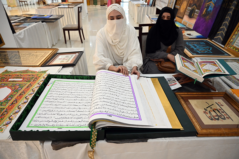 Women displaying Islamic calligraphy artwork during the 3rd Pakistan Hajj & Umrah Exhibition 2025 at Pak-China Friendship Centre