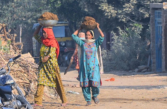 Women on the way while carrying cow dung for preparing the dung cakes for domestic fire use at Latifabad.