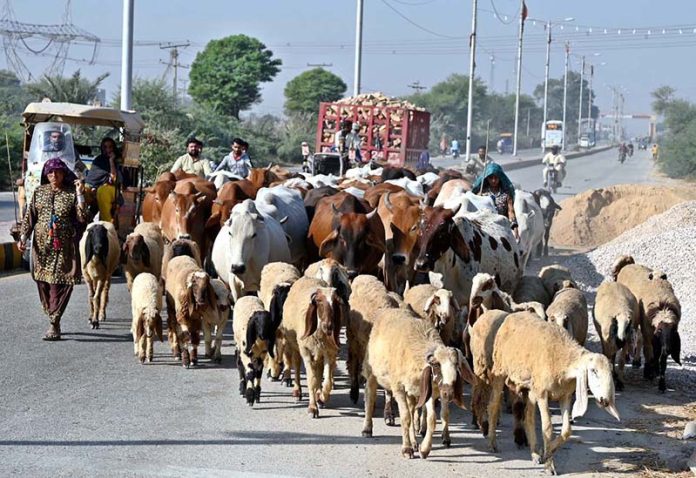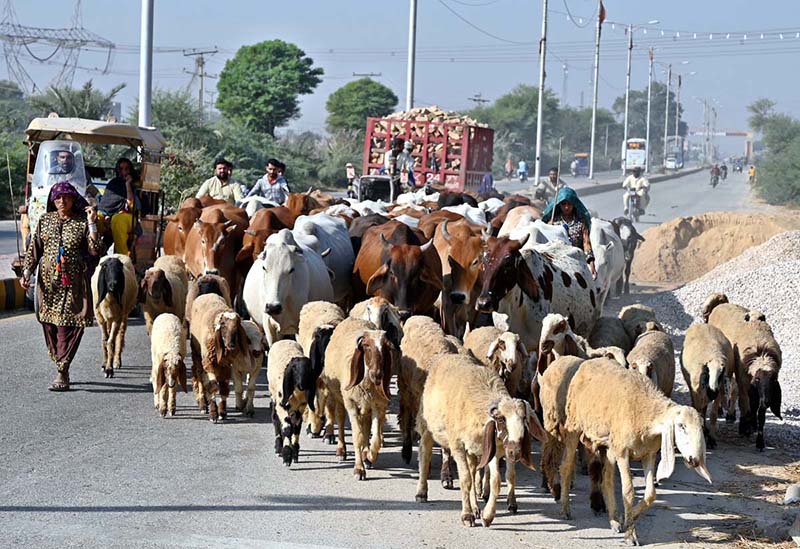 Women shepherds guide a herd of sheep and cow across the Larkana-Dadu Road near PTS.