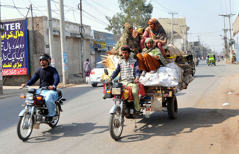 Women traveling on loaded tricycle loader along Vehari Road, risking their lives and potentially causing a mishap due to unsafe transportation.