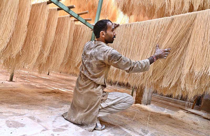 Worker busy arranging and hanging vermicelli (seviyan) on the bamboos stand for drying purpose after preparing it, ahead of Eid-ul-Fitr at local factory.