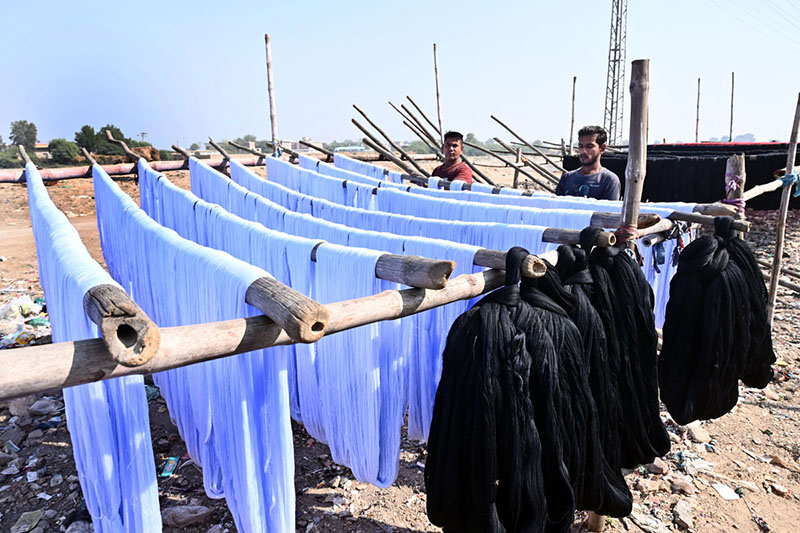 Workers busy dyeing yarn and laying it out to dry in the sun after processing at a factory in the Phulei area