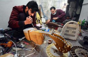 Workers busy in making traditional musical instrument (Rabab) at his workplace near Dabgari area