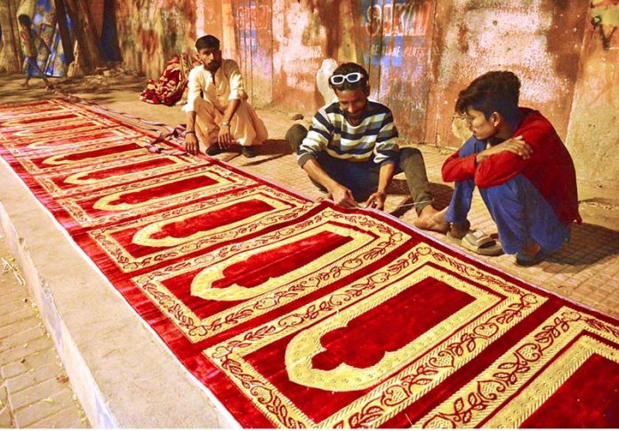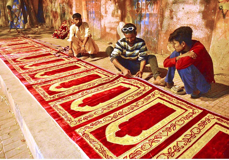 Workers busy in preparing the prayer mats along Radio Pakistan road.