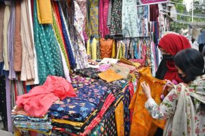 Workers dying clothes as per customers demand ahead of Eid-ul-Fitr at Aabpara Market