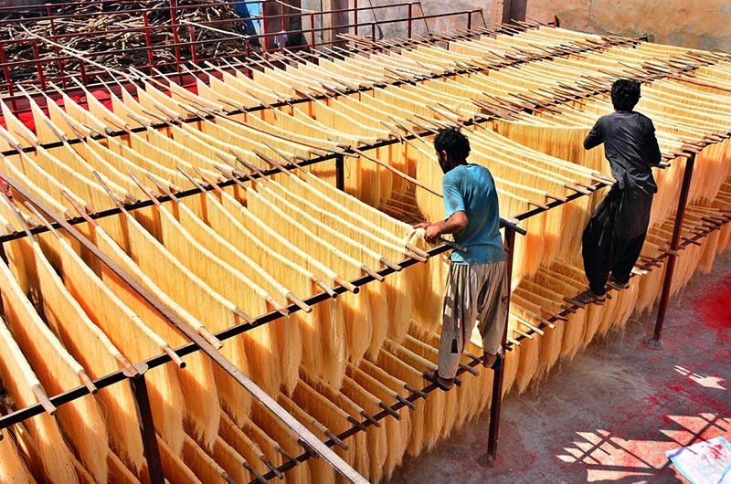 HYDERABAD: March 03 – A worker hangs vermicelli (seviyan) on bamboo stands for drying after preparation, as demand surges ahead of Eid-ul-Fitr at a local factory in Paretabad during the holy month of Ramazan. APP/FHN/MAF/TZD/FHA