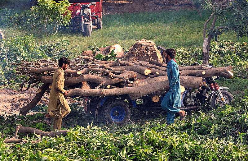 Workers load freshly cut mango tree logs onto a motorcycle cart for transport. APP14-160825MULTAN: August 16 – Previous Post – Farmers are busy in manually leveling land and make rows using traditional tools. Next Post Labourers painting roadblocks near Head Muhammad Wala Road as part of ongoing measures to regulate traffic and prevent accidents.