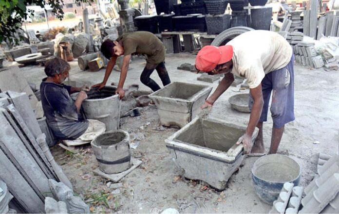 Workers preparing cement-sand blankets at their work site in Shahdara
