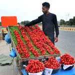 Workers weigh dried fodder into large sacks using a traditional balance scale at a local storage yard, preparing the material for transportation and sale. APP04-260326MULTAN: March 26 – Previous Post A PDA staffer ploughs and plants seasonal saplings at a greenbelt near the Motorway Toll Plaza. Next Post A roadside vendor arranges and displays fresh strawberries on a wooden cart along a city road to attract customers.
