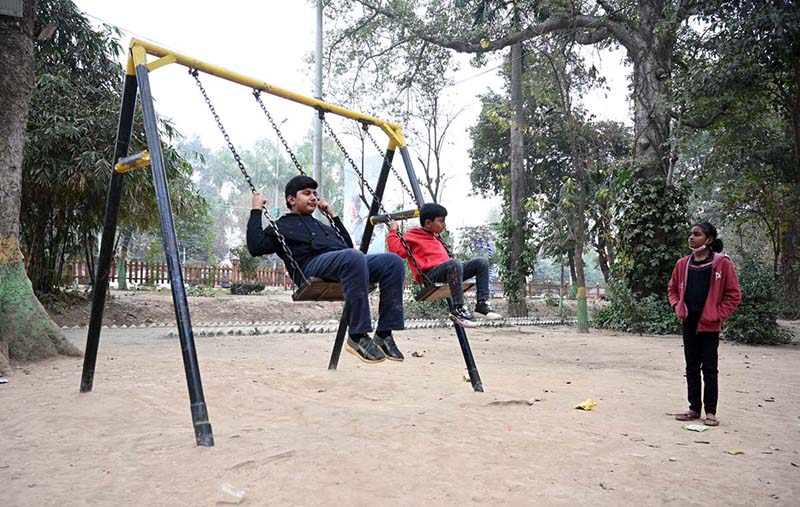 Youngsters enjoy swings at a local park in the city