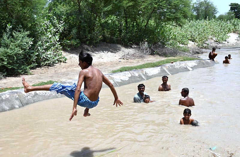 HYDERABAD: June 25 – Youngsters jumping and bathing in Khesana Mori Canal to get some relief from scorching hot weather in the city.
