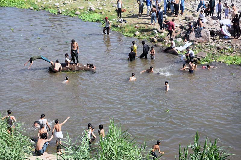 Youngsters jumping and bathing in nullah korang to get relief from scorching hot weather in Federal Capital.