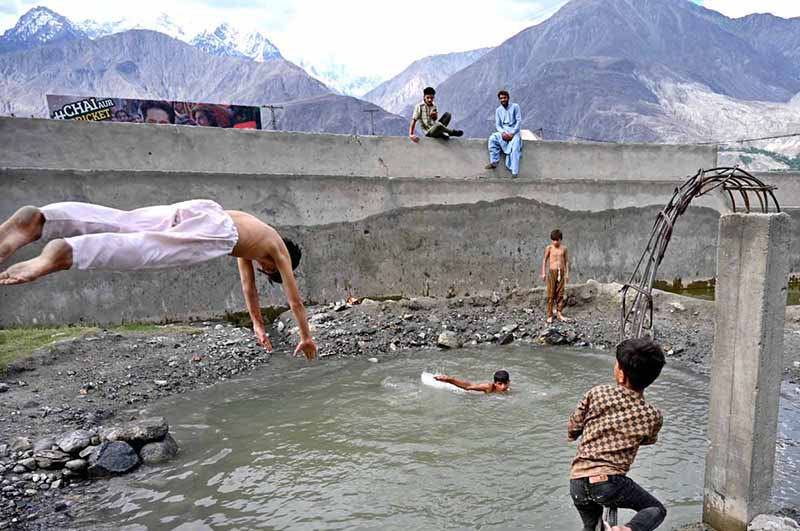 GILGIT: July 01 – Youngsters jumping and bathing in water pound to get relief from hot weather in city.