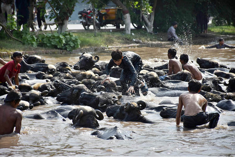 Youngsters with buffalos bathing in a canal to get relief from scorching hot weather due to increasing temperature in Provincial Capital