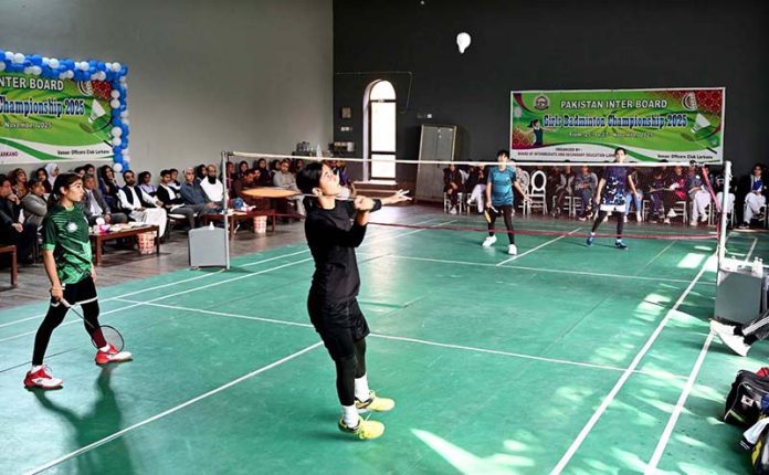 Badminton women players of Islamabad and Lahore Board teams in action during the final match of the All Pakistan Inter Board Girls Badminton Championship 2025 at the Officers Club, organized by the Larkana Board of Intermediate and Secondary Education.