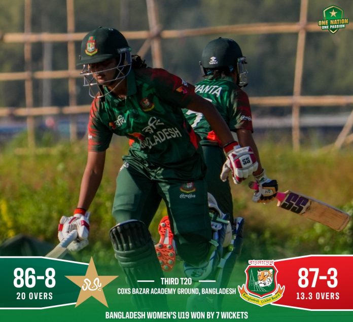 ISLAMABAD, Dec 7 (APP): Bangladesh Women’s U19 beat Pakistan Women’s U19 by seven wickets in the third match of the five-match T20 series played at the Cox’s Bazar Academy Ground on Sunday.