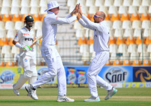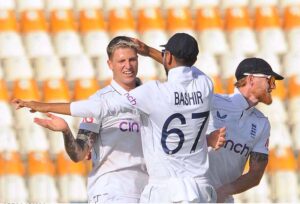 MULTAN: October 15 – Zak Crawley and Jack Leach of England celebrate after the dismissal of Shan Masood during the first day of the second Test between Pakistan and England at Multan Cricket Stadium. APP/QSM/MAF/TZD/ABB