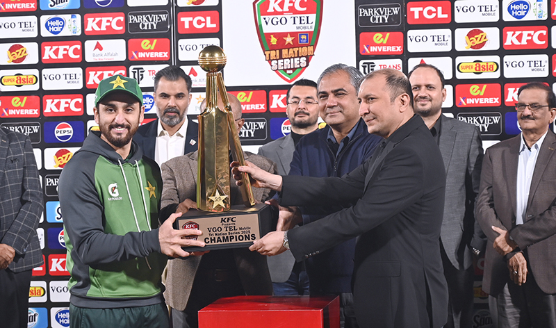 RAWALPINDI: November 29 – Federal Minister for Interior and Narcotics Control and PCB Chairman, Senator Syed Mohsin Raza Naqvi, presents the trophy to Pakistan T20 captain Salman Ali Agha after Pakistan’s victory over Sri Lanka in the T20I Tri-Nation Series final at the Rawalpindi Cricket Stadium. APP/ADZ/ABB