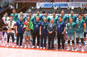 ISLAMABAD: May 17 – Kyrgyzstan Volleyball Team captain receives the Trophy of 3rd position of the 2nd Engro Central Asian Volleyball Championship 2024 after beating Afghanistan at Pakistan Sports Complex.
