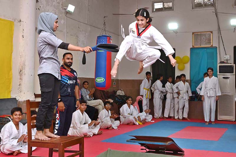 SARGODHA: October 02 – Marshal art young student demonstrate her skills during the Karate Academy Belt Promotion ceremony at the University of Sargodha. APP/HSD/MAF/TZD/SSH