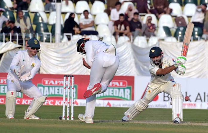 RAWALPINDI: October 20 – Pakistani batter Muhammad Rizwan playing a shot during the first day of the second Test match between Pakistan and South Africa at the Rawalpindi Cricket Stadium. APP/ADZ/MAF/TZD/FHA