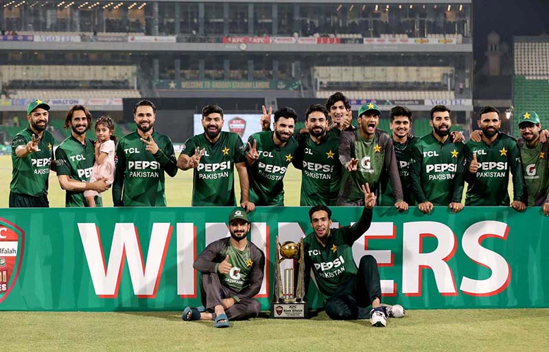 Pakistani players pose for a group photo with the winning trophy after clinching the T20 International three-match series against Bangladesh at Gaddafi Cricket Stadium. APP38-010625LAHORE: June 01 – Previous Post Pakistan’s batter Muhammad Haris celebrated after completed century score during the Third T20 International cricket match between Pakistan and Bangladesh of the three match series at the Gaddafi Cricket Stadium. Next Post Lifting of Israeli blockade ‘only way to avert mass starvation’ in Gaza: UNRWA chief