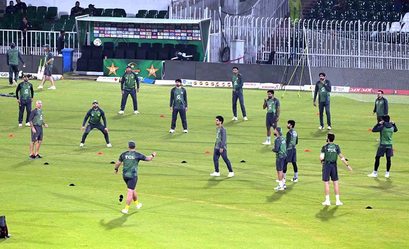 RAWALPINDI: October 27 – Pakistan’s players participating in a practice session ahead of the first T20 cricket match between Pakistan and South Africa at Pindi Cricket Stadium. APP/ADZ/TZD/FHA