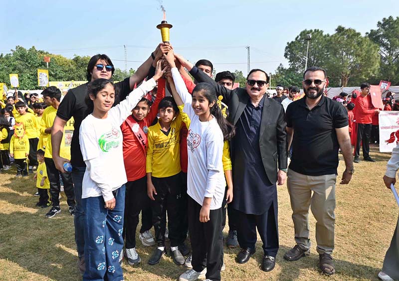 Secretary Workers Welfare Fund Zulfiqar Ahmad joins students holding torches to kick off the opening ceremony of Kaiynaat School System’s Annual Sports Gala 2025 at Sector I-10.