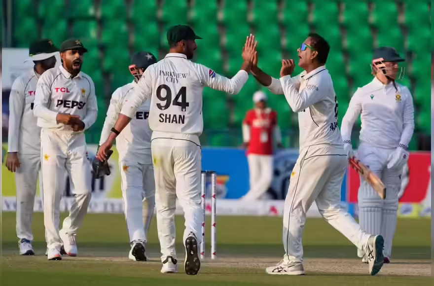 Noman Ali 6-112 matched Senuran Muthusamy’s heroics for South Africa the other morning and Sajid Khan 3-98 picked three wickets while part-timer Salman Agha claimed one wicket for 24 runs.