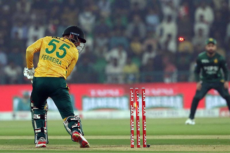 LAHORE: October 31 – South Africa batter George Linde bowled out by Faheem Ashraf during the second T20 international cricket match between Pakistan and South Africa at the Gaddafi Stadium. APP/MTF/FHA