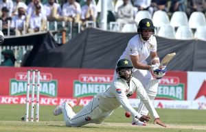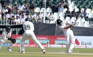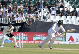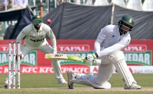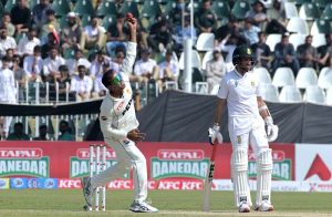 RAWALPINDI: October 22 – South Africa’s batter Keshav Maharaj plays a shot during third day of the second Test match between Pakistan and South Africa at Rawalpindi Cricket Stadium. APP/ADZ/MAF/TZD