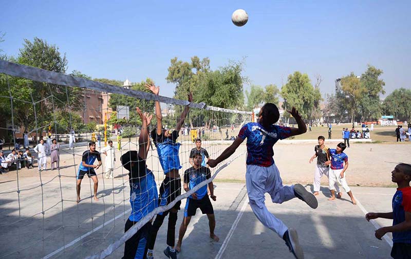 PESHAWAR: November 05 – Volleyball players are in action during Annual Sports Tournament 2025 of Government Middle Schools District Peshawar. APP/SYR/MAF/TZD
